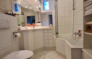 Das en-suite Badezimmer ist ausgestatten mit Badewanne, Dusche und WC. Handtücher,